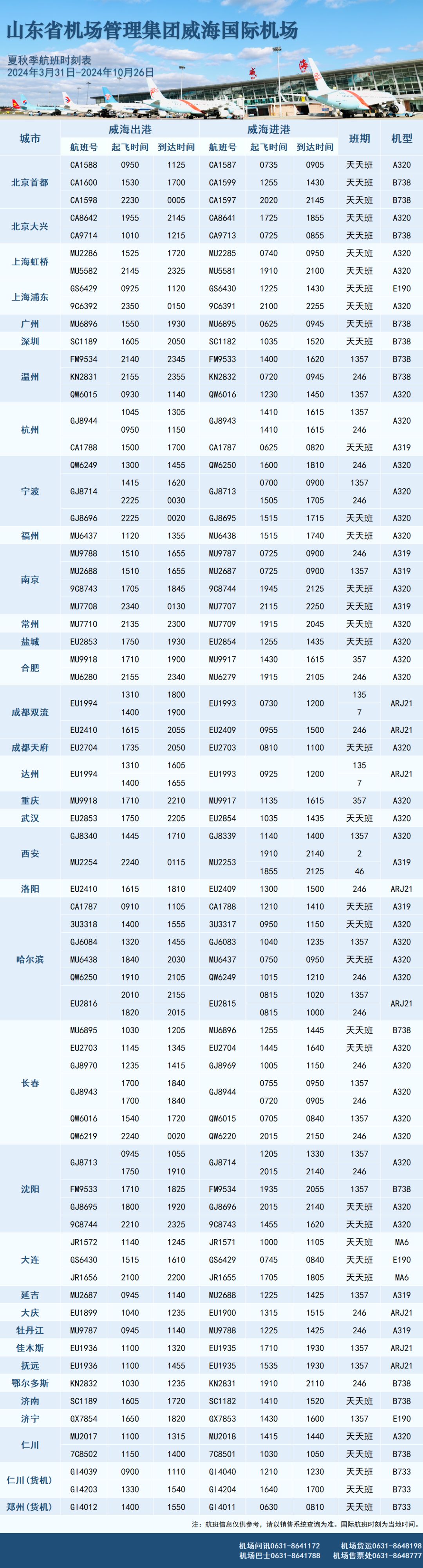 3U3317航班由四川航空執(zhí)飛,9:50由哈爾濱起飛,11:50抵達(dá)威海,14:00由威海起飛,15:55抵達(dá)哈爾濱,每天運(yùn)營1班,執(zhí)飛機(jī)型為A320,這是威海機(jī)場與四川航空合作運(yùn)營的首條航線,至此,在威海機(jī)場運(yùn)營的航空公司增至15家。常州是威海機(jī)場新開航點(diǎn)。截至目前,威海機(jī)場通達(dá)航點(diǎn)達(dá)到35個(gè)。威?!V莺桨?9:15由常州起飛,20:45抵達(dá)威海,21:35由威海起飛,23:00抵達(dá)常州,每天運(yùn)營1班,執(zhí)飛機(jī)型為A320。
