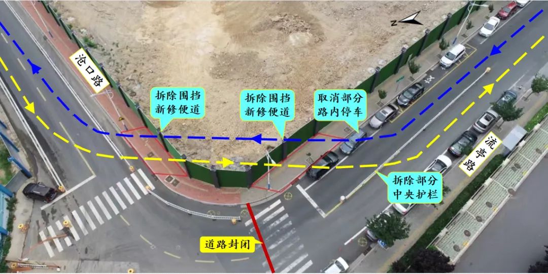 三、通行方案:施工期間,流亭路與滄口路交叉口南側(cè)道路封閉,在原有道路南側(cè)修筑便道,滿足車輛雙向兩車道通行。施工期間便道兩側(cè)禁止停車。